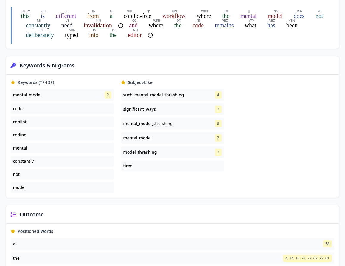 To help make sense of this, a test tool was built that runs the language processing pipeline in isolation, and outputs annotated intermediate results for human inspection.